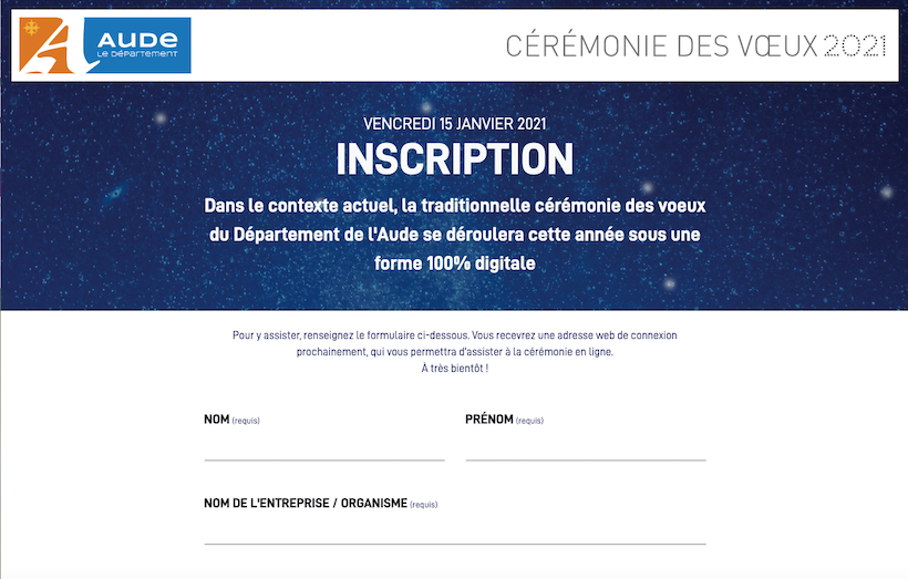 Si vous souhaitez assister à la cérémonie en ligne, placée sous le signe du partage, de l'innovation, de l'entraide, de la résilience, de la convivialité, de la générosité, de l'audace et de la solidarité, cliquez sur https://voeux2021.aude.fr/inscription et renseignez vos coordonnées.