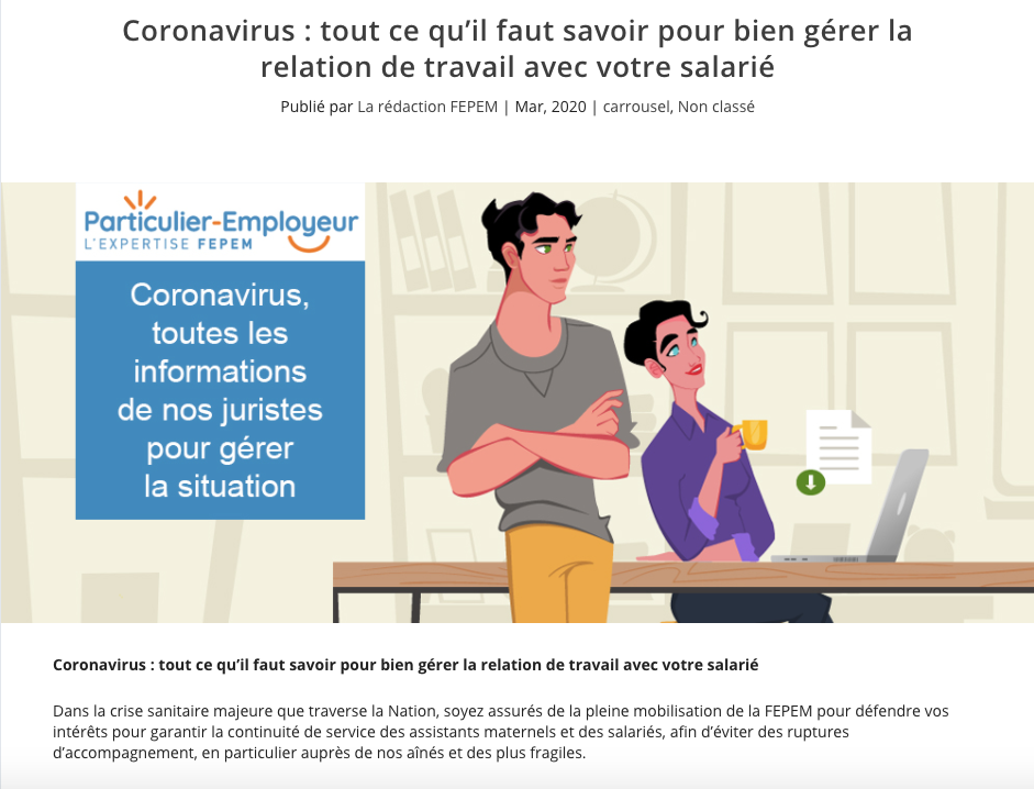 Pour les y aider, la fédération des particuliers employeurs de France (FEPEM), avec qui le Département a passé une convention, a mis en place un dispositif d'information exceptionnel en éditant une foire aux questions, afin de répondre aux interrogations des particuliers, mais aussi des professionnels. Mise à jour tous les jours, elle permet d'aider à bien gérer la relation de travail avec son salarié, dans les conditions actuelles, et apporte des renseignements sur les démarches éventuelles à suivre.