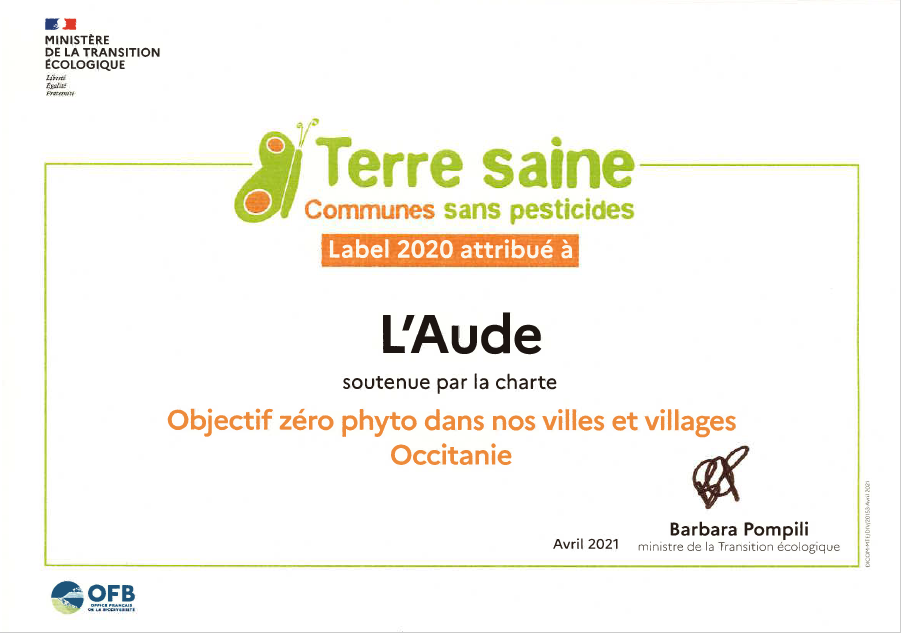 Son obtention, en 2019, avait fait de l'Aude le premier département de France à obtenir le label "Terre saine". Une position de "bon élève" que la collectivité a conservé puisque le diplôme, signé de la ministre de la Transition écologique Barbara Pompili, lui a de nouveau été attribué, au titre de l'année 2020.
