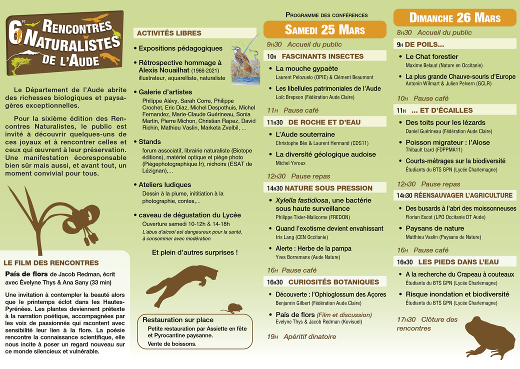Au-delà de plusieurs expositions, d’ateliers ludiques, de stands d’associations, de vente de matériel pour le parfait naturaliste, de la présence d'une librairie... ces rencontres permettent surtout de découvrir la richesse particulièrement importante de nos espaces naturels par des conférences tout public menées par des spécialistes reconnus. Toutes se dérouleront au lycée Charlemagne de Carcassonne, route Saint-Hilaire.