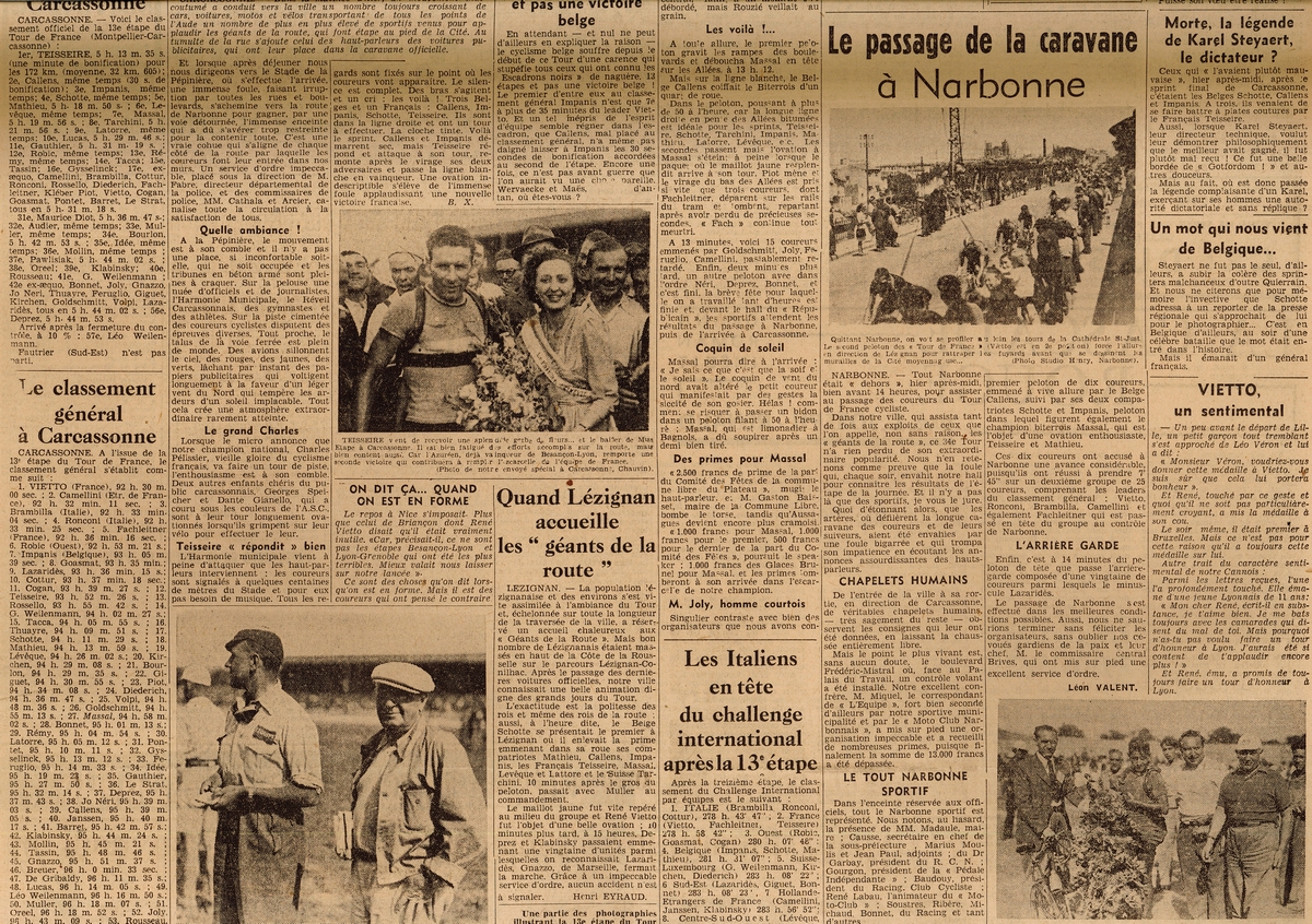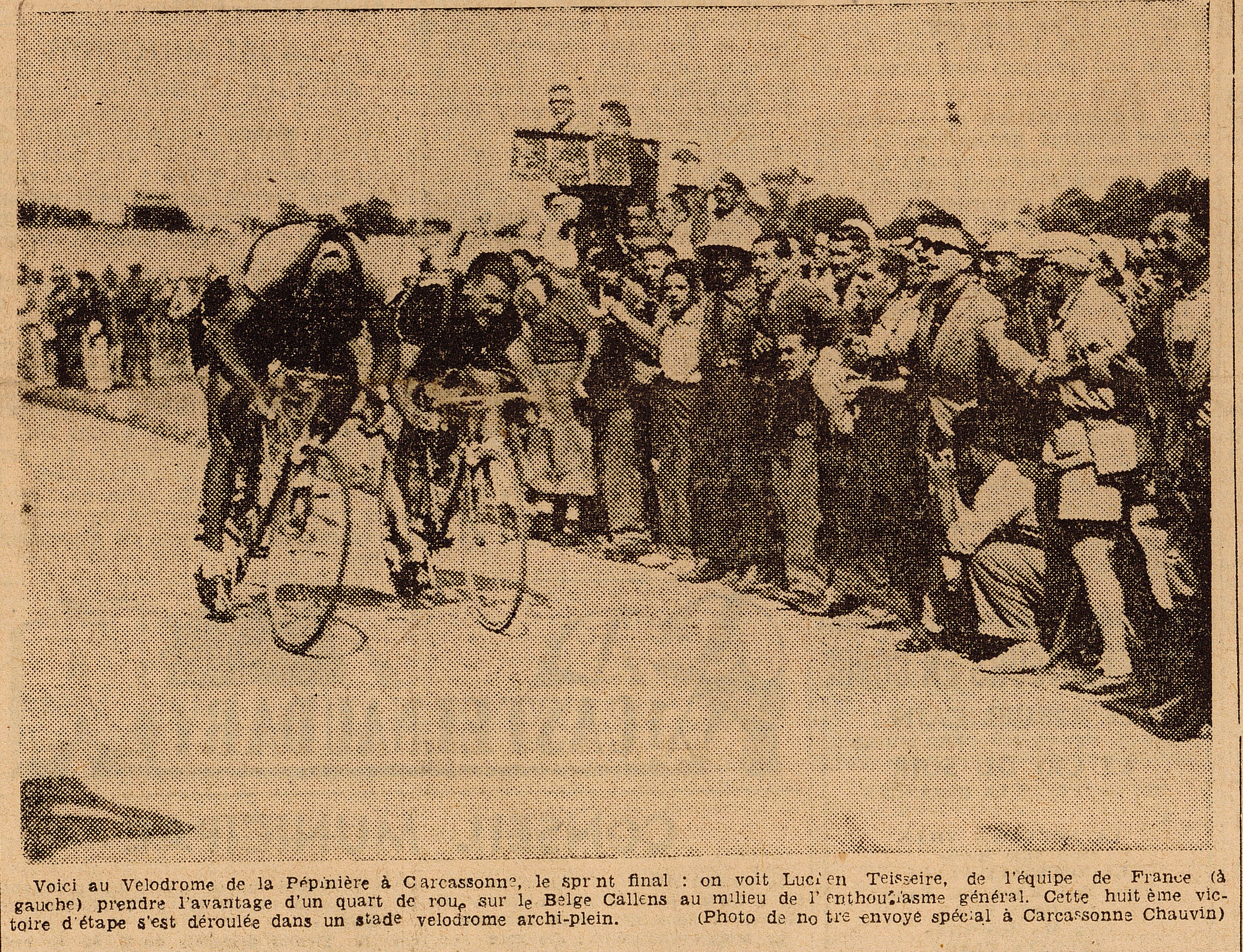 En 1947, c’est la reprise du Tour de France après l’interruption liée à la guerre. Et c’est la première fois qu’il s’arrête à Carcassonne, le 11 juillet, avec l’étape Montpellier-Carcassonne qui se termine au vélodrome de la Pépinière (stade Albert Domec). Le lendemain, les coureurs repartent vers Bagnères-de-Luchon.