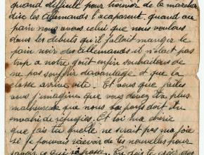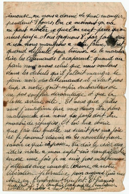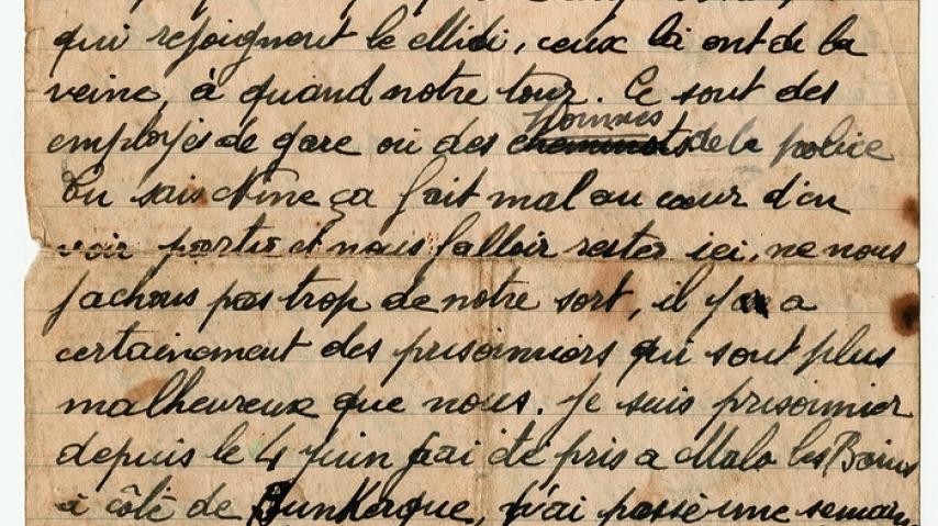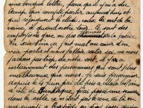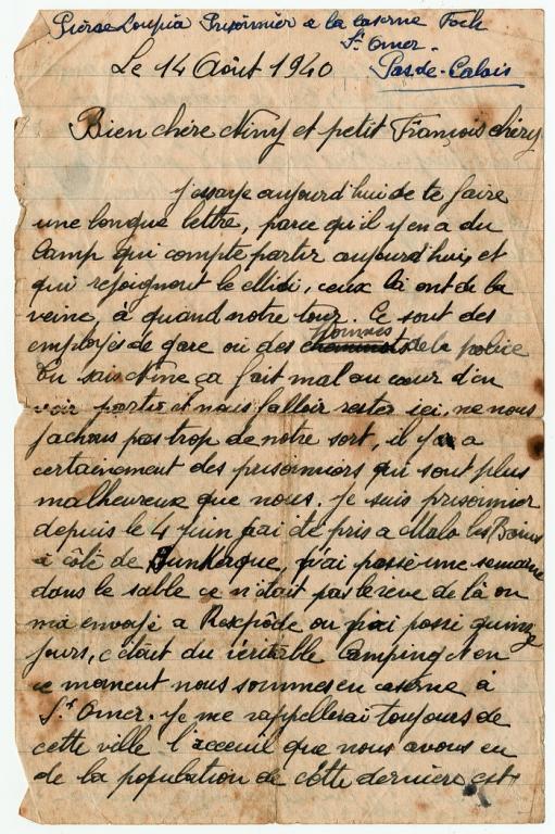 "J’essaye aujourd’hui de te faire une longue lettre parce qu’il y en a du camp qui compte partir aujourd’hui et qui rejoignent le Midi, ceux-là ont de la veine, à quand notre tour. Ce sont des employés de gare ou des hommes de la police. Tu sais Nine, ça fait mal au cœur d’en voir partir et nous falloir rester ici, ne nous fachons pas trop de notre sort, il y a certainement des prisonniers qui sont plus malheureux que nous. Je suis prisonnier depuis le 4 juin, j’ai été pris à Malo les Bains à côté de Dunkerque, j’ai passé une semaine dans le sable, ce n’était pas le reve, de là on ma envoyé a Rexpôde [Rexpoëde] ou j’ai passé quinze jours, c’était du véritable camping et en ce moment nous sommes en caserne à St Omer. Je me rappellerai toujours de cette ville, l’accueil que nous avons eu de la population de cette dernière est imense, on nous a donné de quoi manger pendant 8 jours. En ce moment ça va on peut acheter ce que l’on veut parce qu’on nous paye. Nous gagnons 8 [francs] par jour, grace à cela nous mangeons a notre faim, C’est quand [même] difficile pour trouver de la marchandise, les Allemands l’acaparent. Quand au pain, nous avons celui que nous voulons, dans les débuts qu’il fallait manger le pain noir des Allemands il n’était pas trop a notre goût, enfin souhaitons de ne pas souffrir davantage et que la classe arrive vite. Et vous que faites vous ? J’imagine que vous devez être plus malheureux que nous, le pays doit être envahi de réfugiés. Et toi ma chérie que fais tu ? Quelle ne serait pas ma joie si je pouvais recevoir de tes nouvelles pour savoir ce qui se passe. Tu dois te créer des idées noire a mon sujet, sois tranquille Nine, encore une fois je ne suis pas malheureux, j’attends avec courage l’heure de notre libération. Je termine pour aujourd’hui ma chérie en t’embrassant bien fort. Et François que fait-il ? Je languis beaucoup de l’embrasser. Mille baisiers a vous tous."