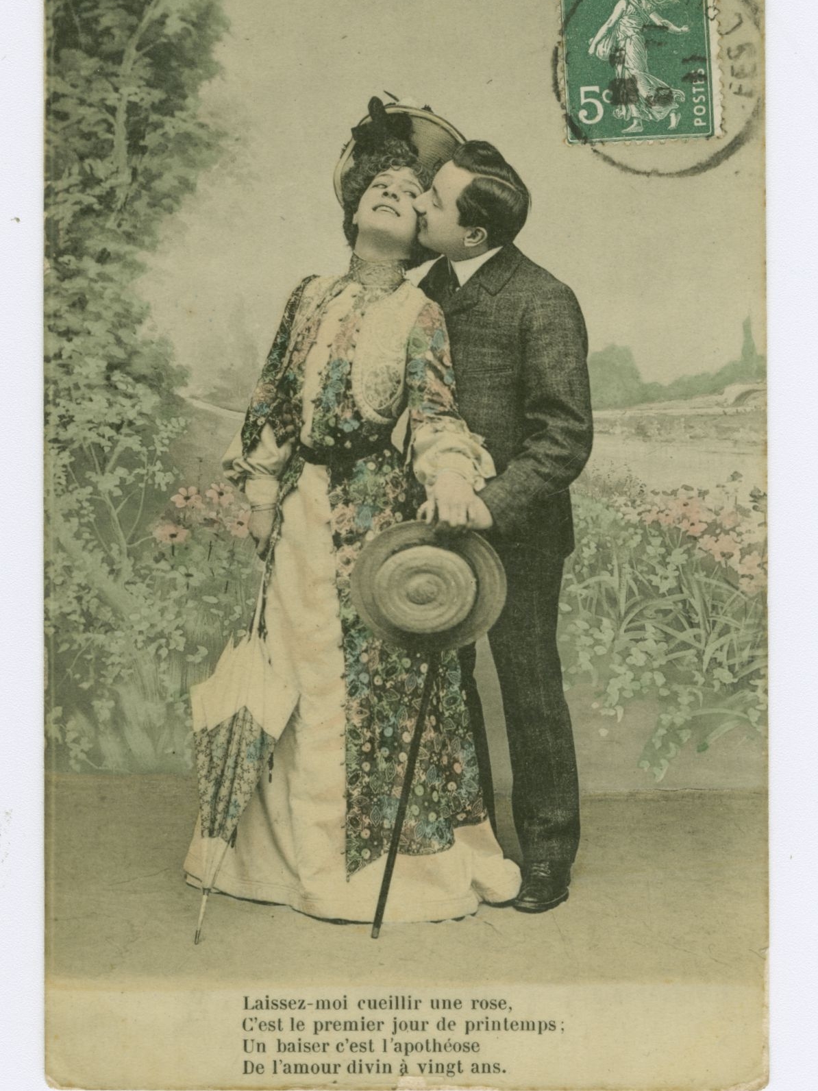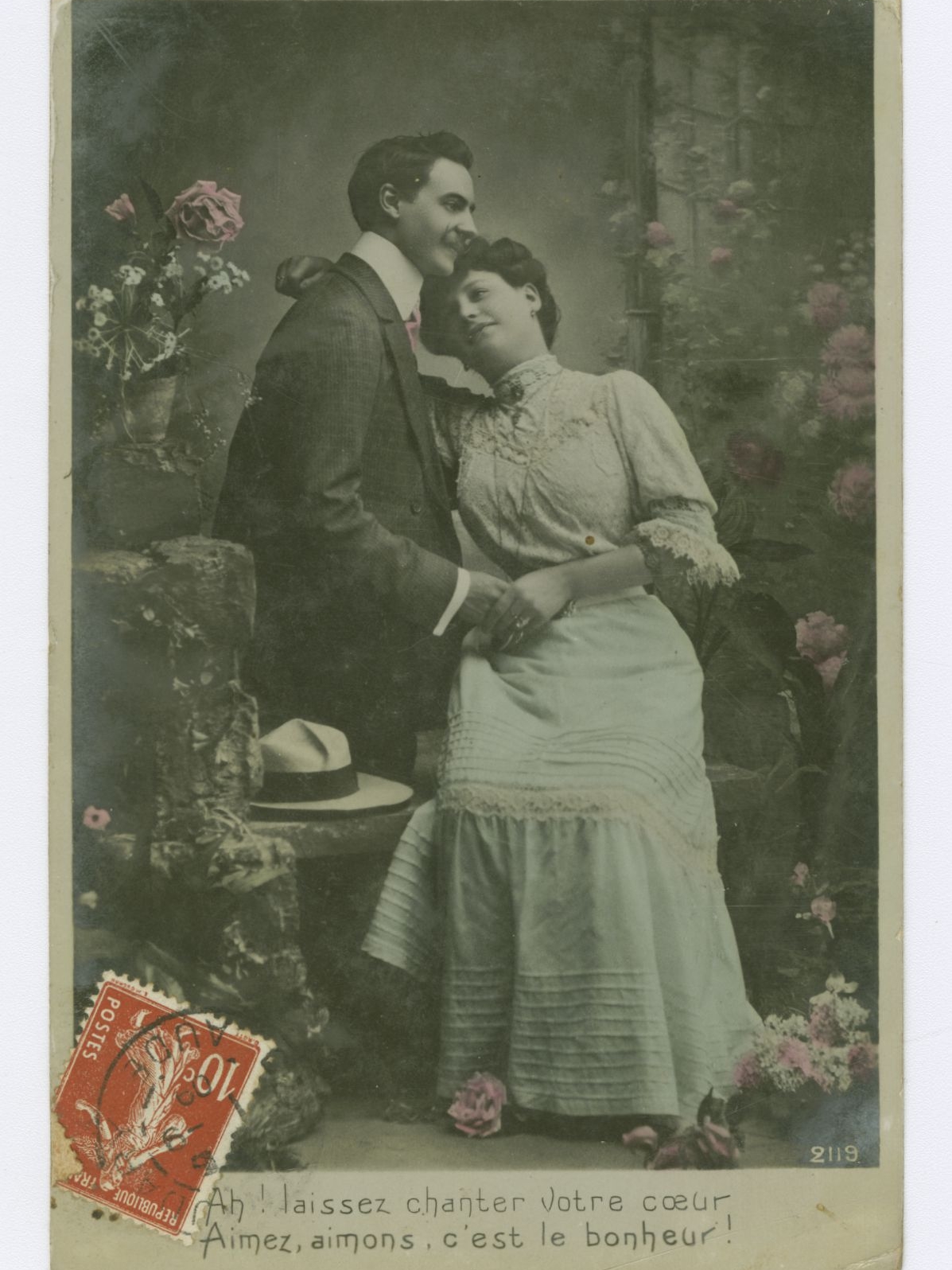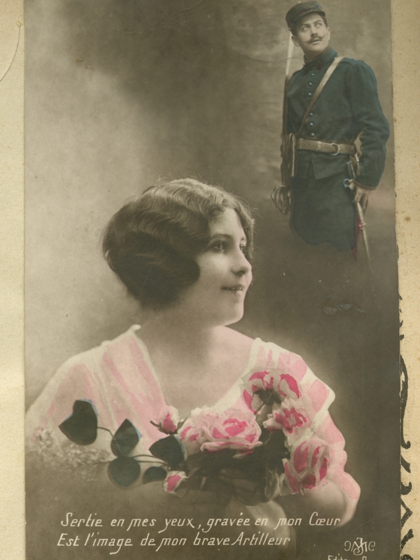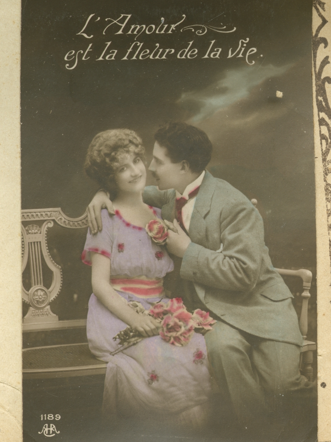 Parmi cette collection, on peut remarquer de nombreuses représentations de l'Amour, notamment au travers de pittoresques scènes de couple. On y voit également beaucoup de duos entre un poilu et sa fiancée. En effet, la Première Guerre mondiale est le premier grand conflit depuis les lois Ferry (1879-1886) qui ont instauré l'école publique gratuite, obligatoire et laïque, en France. Cela a conduit au développement des correspondances entre le front et l'arrière, et des correspondances amoureuses en particulier. En plus du côté amoureux, nombre de ces cartes ont un sous-texte patriotique : les conditions de vie au front et à l'arrière sont très dures et la correspondance permet aux uns et aux autres de tenir.