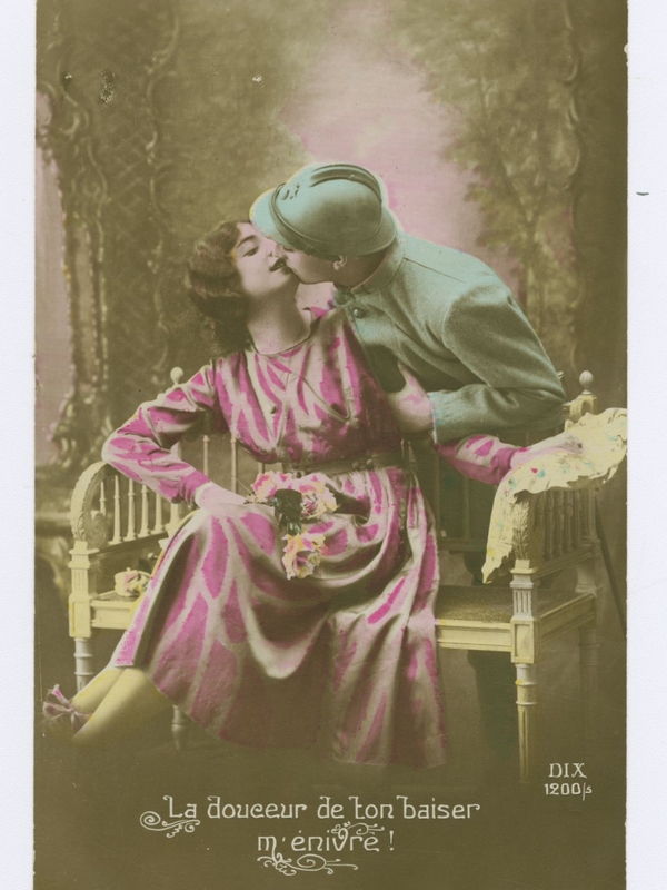 Bien sûr, il n'y a pas que des scènes avec un poilu et sa fiancée, mais également de nombreuses mises en scène imaginatives, reprenant les critères incontournables du romantisme : des fleurs, des poses langoureuses, des baisers, des sourires, des expressions de timidité... Et les maximes qui légendent les cartes renforcent ce sentiment, ainsi que les douces couleurs pastel ajoutées aux clichés sépias. Mais les cartes collectionnées par Antonia Louis renferment un secret. Elles sont collées et ne peuvent pas être manipulées : nous ne saurons donc jamais si leurs versos sont vierges ou s'ils contiennent les plus tendres mots d'un amoureux éperdu !