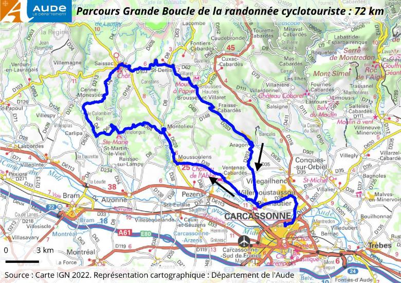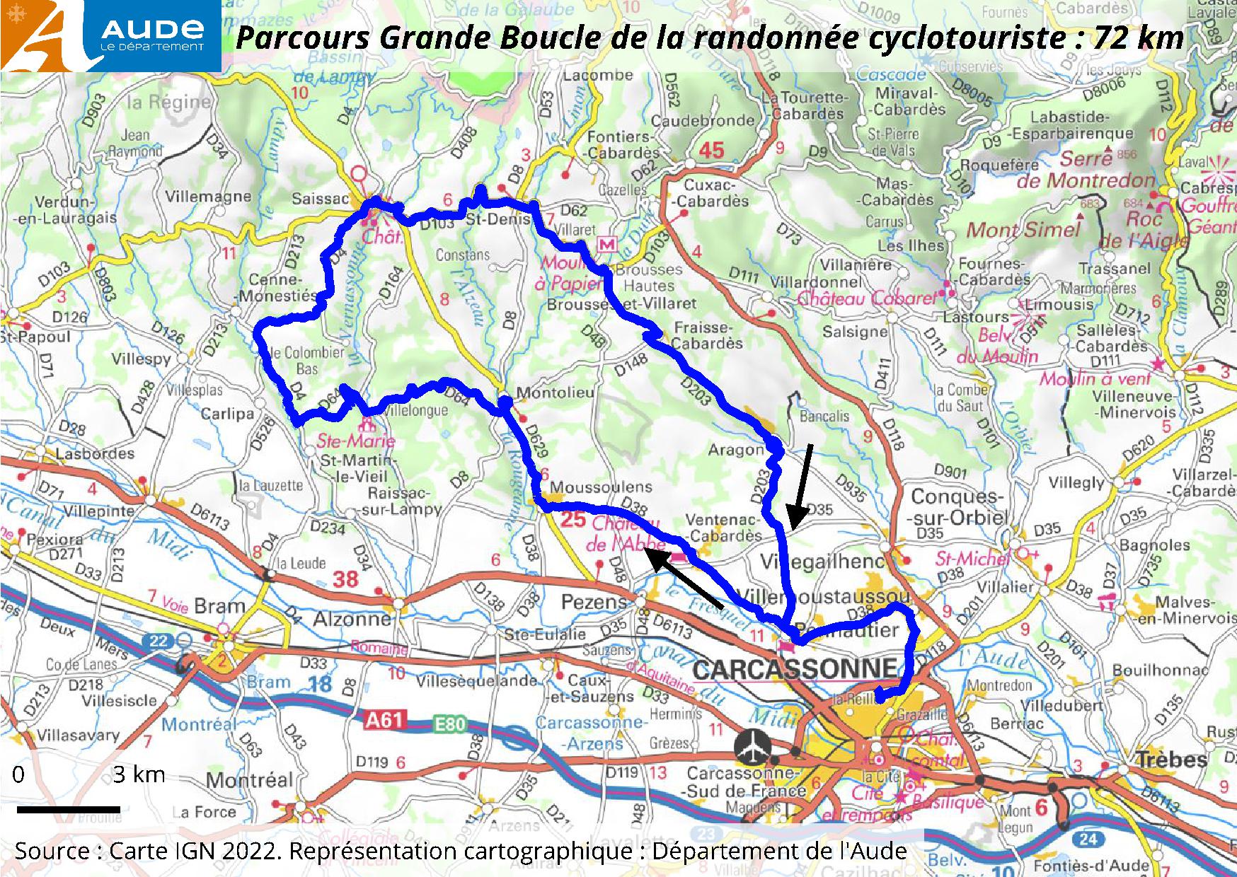 Grand parcours de 72 km. Carcasssonne, Villemoustaussou, Pennautier, Ventenac-Cabardès, Moussoulens, Montolieu, Villelongue, D4, Saissac, Saint-Denis, Brousses-et-Villaret, Fraisse-Cabardès, Aragon, Pennautier, Villemoustaussou, Carcassonne.