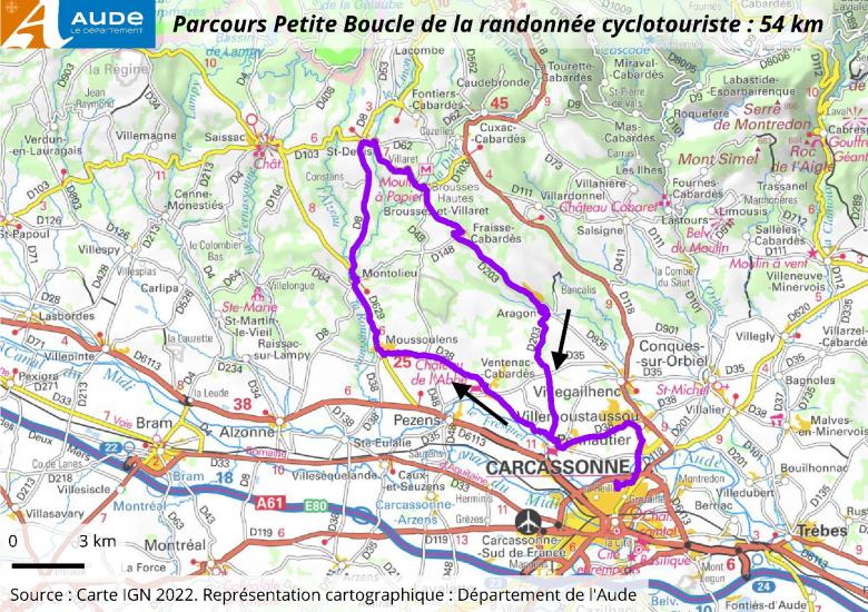 Petit parcours de 54 km. Carcasssonne, Villemoustaussou, Pennautier, Ventenac-Cabardès, Moussoulens, Montolieu, Saint-Denis, Brousses-et-Villaret, Fraisse-Cabardès, Aragon, Pennautier, Villemoustaussou, Carcassonne.