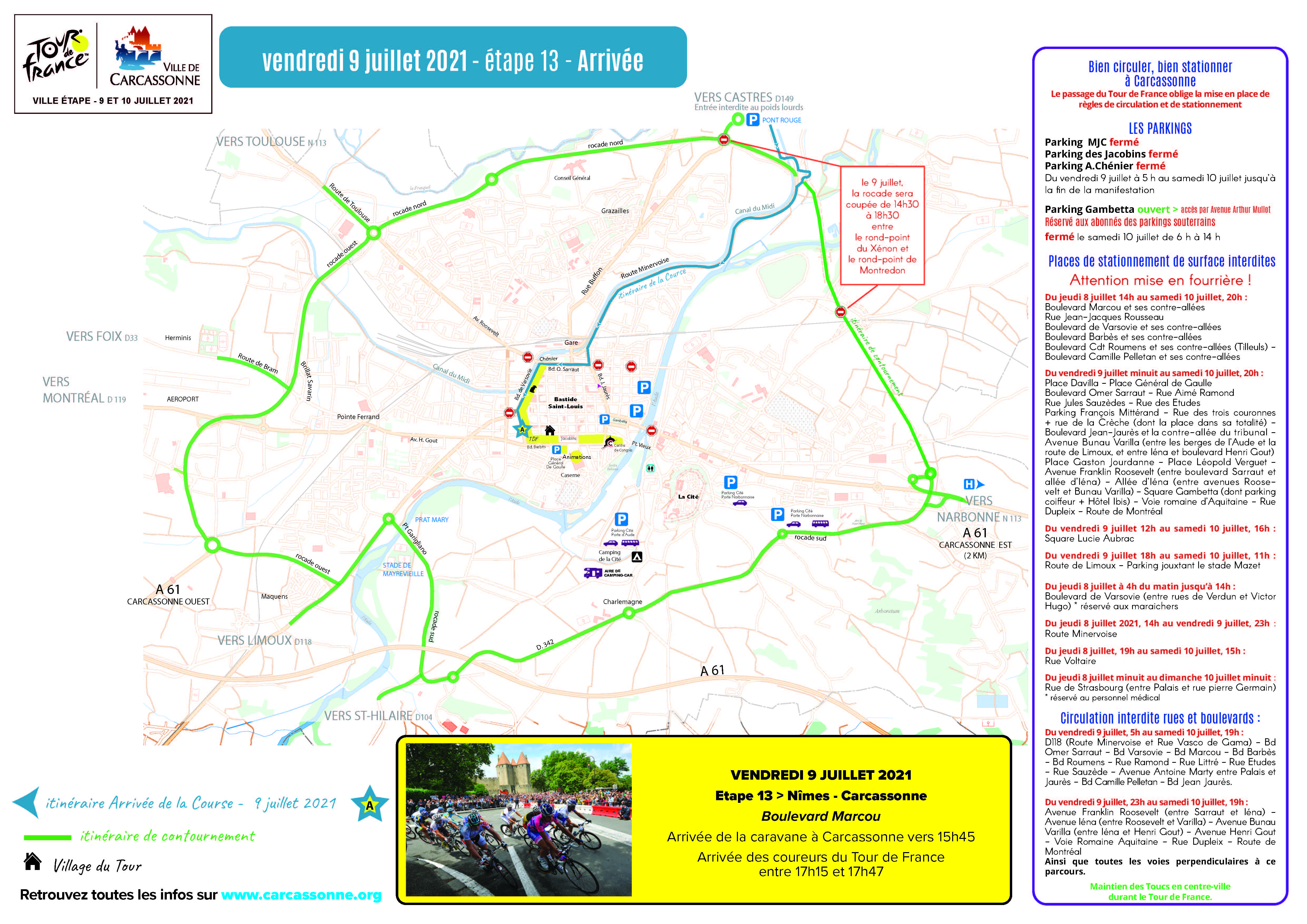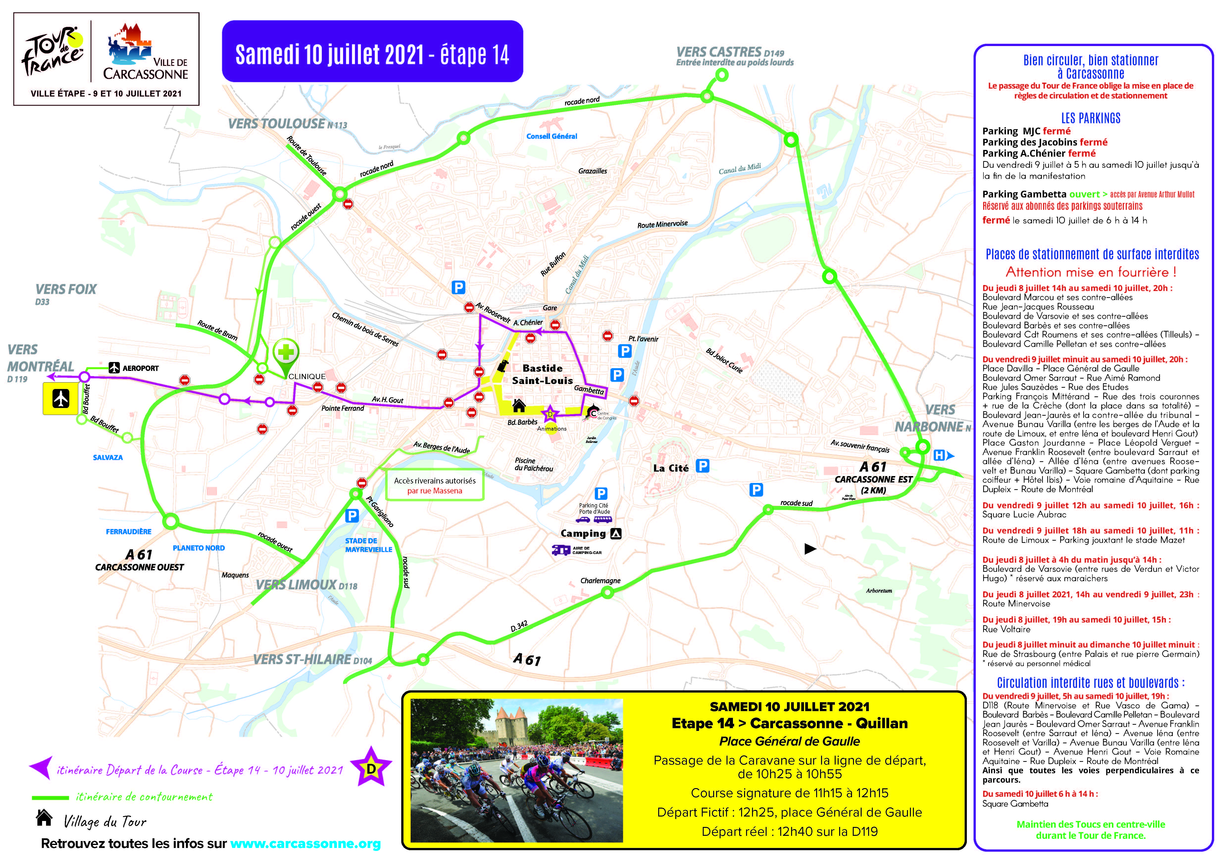 Pour faciliter le passage des coureurs, différents axes routiers vont être temporairement fermés à la circulation, le long du parcours. Pour tout savoir sur les conditions de circulation sur, et aux abords du tracé des deux étapes audoises du Tour de France, rendez-vous sur inforoute.11.