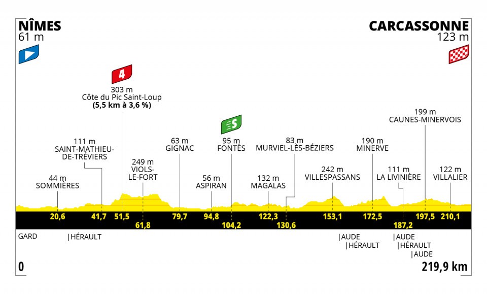 219,9 km de plat au cours lesquels les coureurs arriveront dans l'Aude par Bize-Minervois, avant de passer au pied de la forteresse médiévale d'Agel, de traverser le somptueux village de Minerve - labellisé l'un des plus beaux de France -, Caunes-Minervois et son abbaye, pour enfin passer la ligne d'arrivée à Carcassonne, en contrebas de la cité, classée au patrimoine mondial de l'Unesco. L'étape 13 en détail.