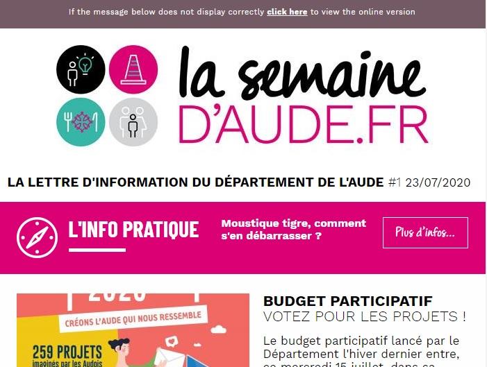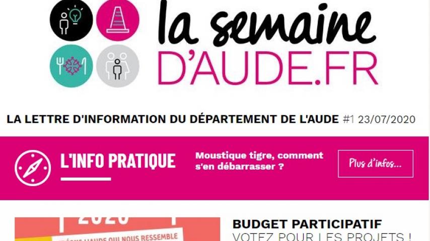 Le Département de l'Aude lance "La semaine d'aude.fr", une newsletter tirée de la mine d'informations disponibles sur son site internet. Inscrivez-vous pour ne rien manquer de l'actualité de votre département !