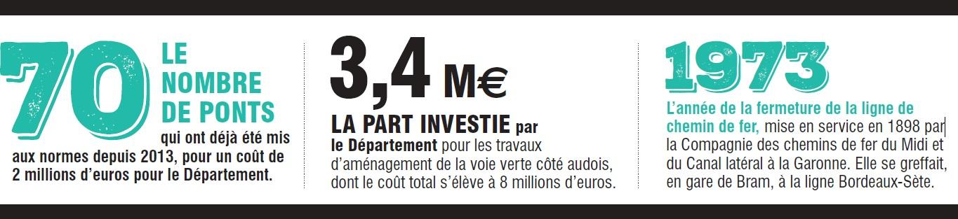 Depuis la première étude de faisabilité en 2012 et les rencontres avec la population, le Département a décidé de lancer, sans attendre, une série de travaux sur près de 70 ponts et une vaste opération de débroussaillage a été opérée en 2018. Afin de respecter les directives de protection des espèces, notamment en période de reproduction, la voie verte sera réalisée en quatre périodes de six mois (de septembre à février) sur quatre tronçons d’une dizaine de kilomètres chacun. Quatre secteurs sont donc concernés : de Saint-Colombe-sur-l’Hers à Chalabre, de Tréziers à Escueillens, de Bellegarde-du-Razès à Cailhau et enfin de Cailhavel à Bram. Cette voie verte constituera un nouvel atout touristique pour notre département.
