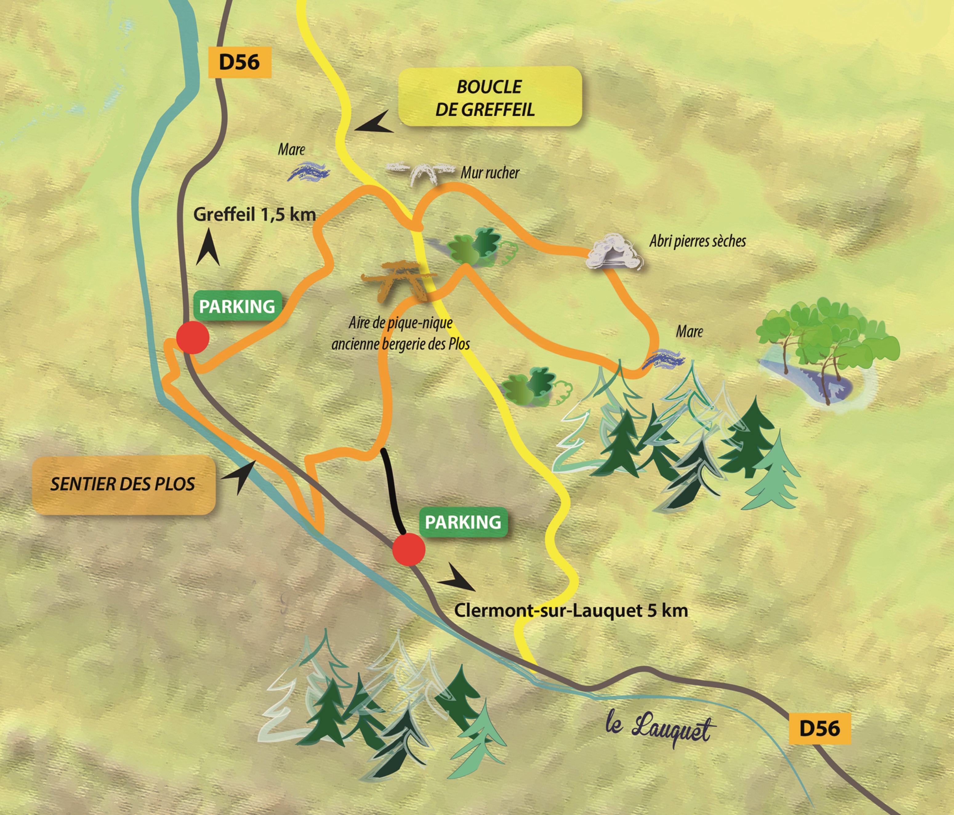 Cette boucle de 3 kilomètres permet de longer la rivière du Lauquet et de traverser la forêt des Plos. Le sentier part du parking situé sur la D56, à la sortie de Greffeil en direction de Clermont-sur-Lauquet. Il descend et longe la rivière puis remonte vers la prairie en bordure de route et entre ensuite dans la forêt. Laissez-vous guider, des panneaux explicatifs avec des détails sur la faune et la flore ponctuent le parcours.