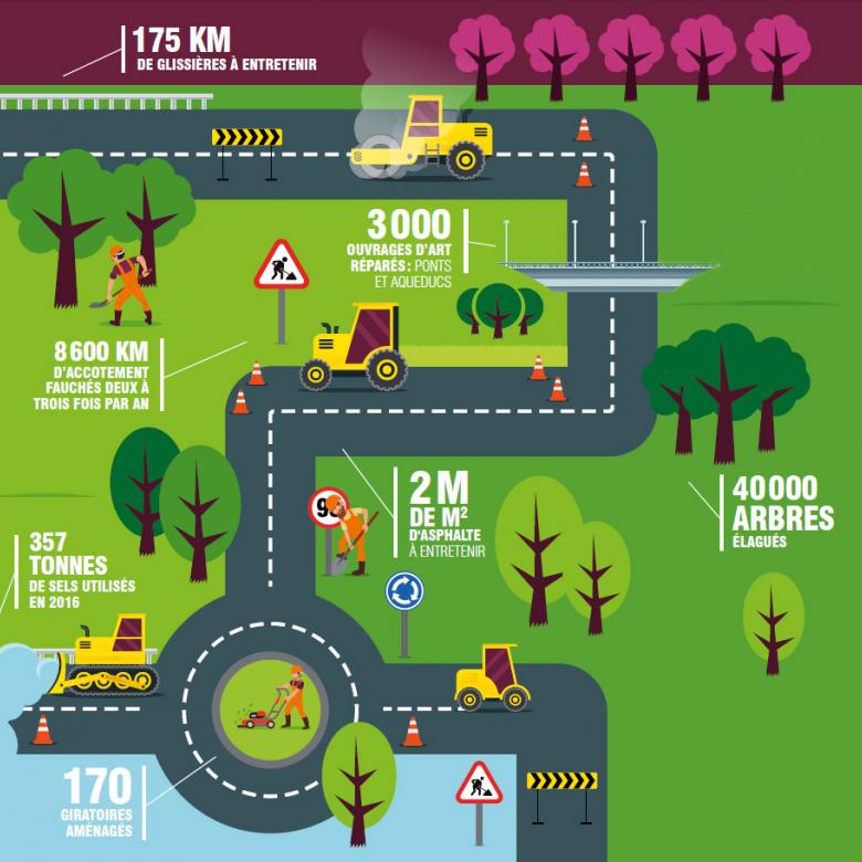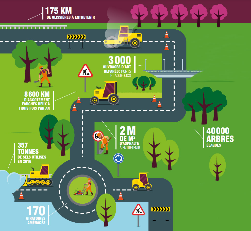 Pour assurer le maintien du réseau en bon état de circulation, le Département est organisé en cinq divisions géographiques. Ainsi, ses agents interviennent, au quotidien, au plus près, pour réparer les chaussées. Ils assurent aussi le fauchage, le débroussaillage, le curage des fossés...