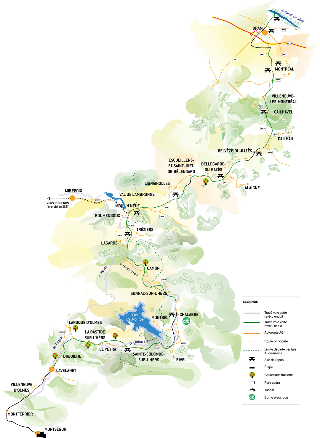 La carte de la voie verte de Bram (Aude) à Montségur (Ariège)