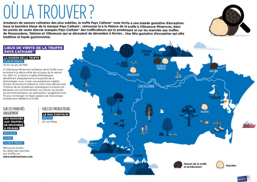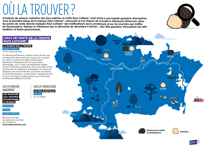 Aujourd'hui, 750 hectares sont dévolus à la trufficulture, dans l'Aude. Un or noir que l'on retrouve sur les marchés qui lui sont dédiés, chaque hiver, entre décembre et février. 600 trufficulteurs sont recensés, pour une production annuelle qui ne dépasse pas quelques tonnes. C'est dire la rareté de la mélanosporum audoise ! Elle n'en reste pas moins "abordable", ce qui, en plus de la qualité de ses arômes, ne fait que croître son succès.