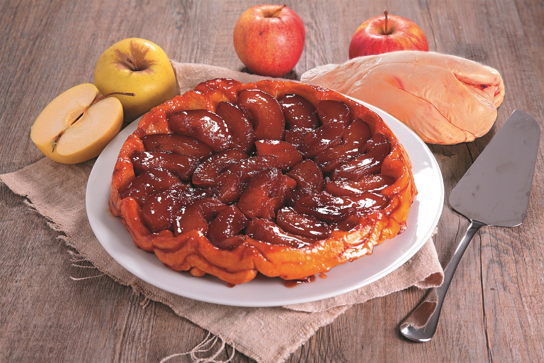 Éplucher la pomme, puis trancher très finement. Dans une poêle, faire fondre le beurre, ajouter les pommes tranchées, puis laisser caraméliser sur un feu moyen. Déglacer avec la réduction de la fine ou du vin choisi. Égoutter la préparation, puis la disposer au fond d’un moule à tarte.