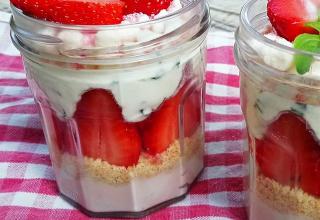 Mettre le strusel au fond de la verrine, mettre une couche de crème, ranger les fraises sur les côtés, un peu de crème au centre quelque morceau de fraises et chantilly. Décorer à l’aide de feuilles de menthe et de fraises.