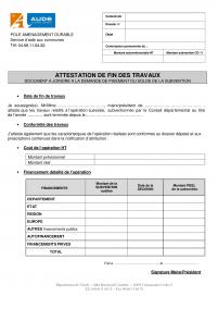 Mots-clés #Aides financières #Élu.e #Association #Entrepreneur.e / Agriculteur.trice Aides financières Attestation de fin des travaux Publié le 3 mai 2019 Attestation de fin des travaux (80.18 Ko) Feuilleter Télécharger Préc. Retour à la liste Suivant