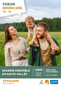Forum Grandir ensemble en Haute-Vallée Programme du forum Grandir ensemble en Haute-Vallée organisé par le Département de l'Aude le 2 avril 2025 à Limoux. Tous les détails dans le dépliant. Publié le 26 février 2025 Forum grandir ensemble en Haute-Vallée 2025 (199.17 Ko) Télécharger Préc. Retour à la liste Suivant